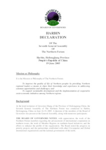 At the kind invitation of Governor Zhang of the Province of Heilongjiang China, the Seventh General Assembly of The Northern Forum was conducted in Harbin, Heilongjiang, China on June 16-19, 2005. A Quorum of the members of the Board of Governors was present at the General Assembly, along with numerous participants.